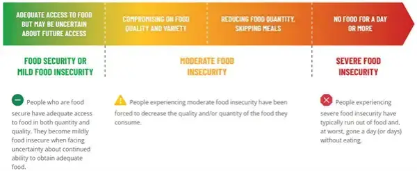 Food Security (FS) means having reliable access to enough nutritionally adequate food in a way that is safe and culturally acceptable. Conversely, Food Insecurity (FI) occurs when a person, family or community lacks regular access to enough safe, nutritious food to support their health and development (1). Food Security and Food Insecurity exist on a spectrum, shown below: