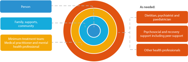 Eating disorders are complex and multifaceted. While the minimum treatment team is a medical practitioner and a mental health professional, input from practitioners from a range of disciplines is often necessary for comprehensive care. Family and supports are integral to the care team.