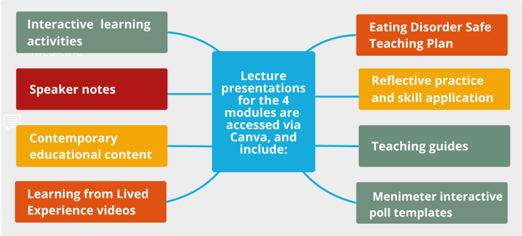 Each module offers ~50 minutes of learning through lectures, interactive activities, reflections, videos, and lived experience perspectives. Educators receive teaching guides, speaker notes, and Mentimeter templates.