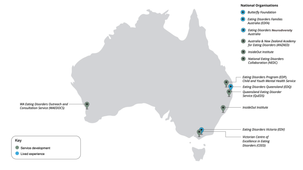 Figure 1: Map of national and state/territory-based eating disorder service development and lived experience organisations in Australia, current as of August 2023.